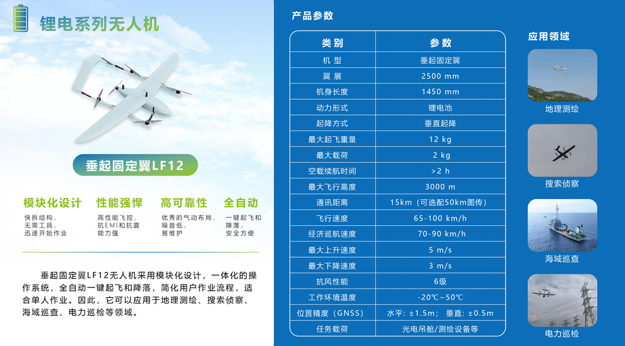 垂起固定翼LF12无人机采用模块化设计,一体化的操作系统,全自动一键起飞和降落,简化用户作业流程,适合单人作业。因此,它可以应用于地理测绘、搜索侦察、海域巡查、电力巡检等领域。